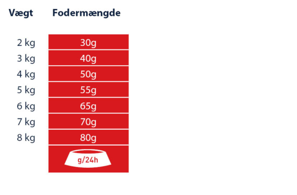 Sørg for, at der er frisk drikkevand til rådighed på alle tidspunkter, i en god afstand fra foderskålen. I betragtning af forskellen mellem de enkelte katte, kan den angivne daglige mængde reduceres med op til 15 %. Opdel den daglige mængde af foder, i flere måltider.