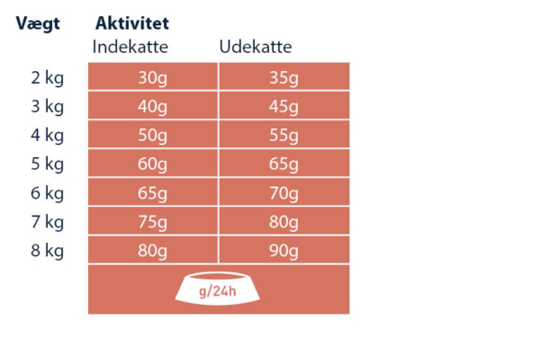 Sørg for, at der er frisk drikkevand til rådighed på alle tidspunkter, i en god afstand fra foderskålen. I betragtning af forskellen mellem de enkelte katte, kan den angivne daglige mængde reduceres med op til 15 %. Opdel den daglige mængde af foder, i flere måltider.