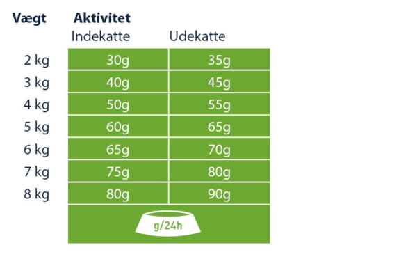 Sørg for, at der er frisk drikkevand til rådighed på alle tidspunkter, i en god afstand fra foderskålen. I betragtning af forskellen mellem de enkelte katte, kan den angivne daglige mængde reduceres med op til 15 %. Opdel den daglige mængde af foder, i flere måltider.
