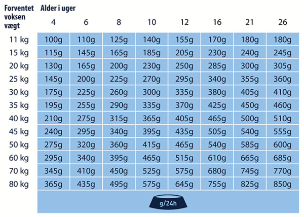 Bemærk: Mængden af foder bør øges gradvist hver 2.-3. dag, til ugentligt indtil den mængde, der anbefales for den næste aldersgruppe, er nået. Fra 27 uger overgår du langsomt til et passende juniorfoder. Vej hvalpene regelmæssigt og dokumenter deres vægtudvikling. Det kan være nødvendigt at justere mængden af foder individuelt. Fodre ikke for meget – vær opmærksom på den moderate vækst. Ved tilsætning af snacks bør fodermængden reduceres tilsvarende. Tip: Brug en del af den daglige foderration som snackserstatning. Giv foderet tør eller tilføj frisk, varmt vand (omkring 50-60° C) og lad det trække i et par minutter. Fordel den daglige foderration på flere måltider (3-4). Sørg for, at der altid er frisk drikkevand til rådighed.