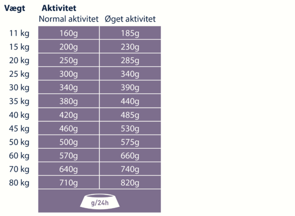 Giv foderet tør eller tilføj frisk, varmt vand (ved omkring 50-60° C) og lad det trække i et par minutter. Sørg for, at der er frisk drikkevand til rådighed på alle tidspunkter. Reducer mængden af foder, hvis du også giver din hund snacks/godbidder. I betragtning af forskellen mellem de enkelte hunde, kan den angivne daglige mængde reduceres med op til 15 %, hvis hunden har tendens til at være overvægtig.