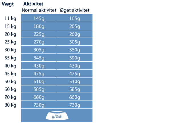 Giv foderet tør eller tilføj frisk, varmt vand (ved omkring 50-60° C) og lad det trække i et par minutter. Sørg for, at der er frisk drikkevand til rådighed på alle tidspunkter. Reducer mængden af foder, hvis du også giver din hund snacks/godbidder. I betragtning af forskellen mellem de enkelte hunde, kan den angivne daglige mængde reduceres med op til 15 %, hvis hunden har tendens til at være overvægtig.
