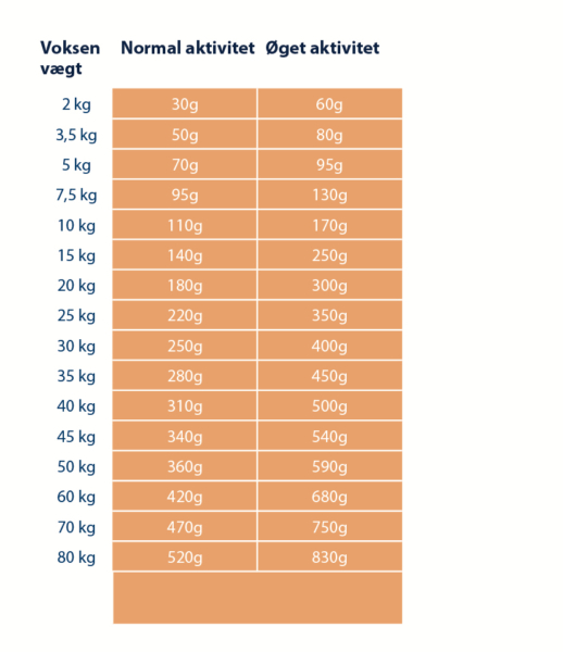 Bland foderet med varmt vand (60 °C) eller hvalpemælk, lad foderet trække til den ønskede konsistens og foderet kan reguleres ved at ændre mængden af vand (grød). Foderet tilpasses de angivende tal i tabellen ud fra hundens normalvægt. På grund af de individuelle behov, kan tallene variere med +/-15%.  Husk altid at hunden har adgang til frisk vand.