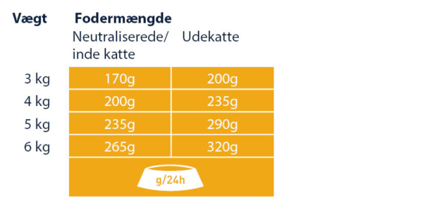 Anbefalet daglig fodermængde ved eksklusiv fodring. 1 pose svarer til cirka 20 g tørfoder. Det individuelle behov afhænger af alder, race og aktivitetsniveau. Sørg altid for friskt vand i en skål, der står væk fra madskålen. Servér ved stuetemperatur.