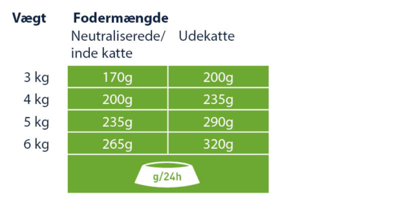 Anbefalet daglig fodermængde ved eksklusiv fodring. 1 pose svarer til cirka 20 g tørfoder. Det individuelle behov afhænger af alder, race og aktivitetsniveau. Sørg altid for friskt vand i en skål, der står væk fra madskålen. Servér ved stuetemperatur.