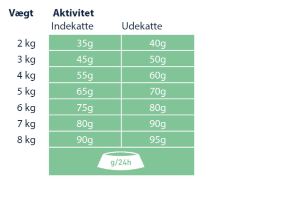 Sørg for, at der er frisk drikkevand til rådighed på alle tidspunkter, i en god afstand fra foderskålen. I betragtning af forskellen mellem de enkelte katte, kan den angivne daglige mængde reduceres med op til 15 %. Opdel den daglige mængde af foder, i flere måltider.