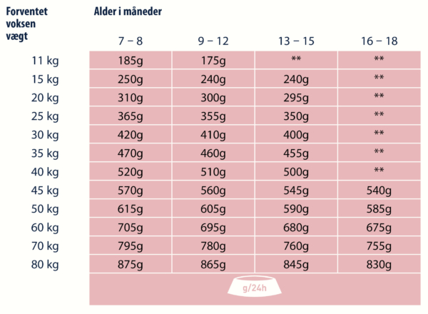 Bemærk: Efterhånden som hunden nærmer sig sin slutvægt, falder energibehovet, og fodermængden bør justeres i overensstemmelse med fodringsvejledningen. Vej unghunden regelmæssigt og dokumenter vægtudvikling. Det kan være nødvendigt at justere mængden af foder individuelt. Fodre ikke for meget – vær opmærksom på den moderate vækst. Ved tilsætning af snacks bør fodermængden reduceres tilsvarende. Tip: Brug en del af den daglige foderration som snackserstatning. Giv foderet tør eller tilføj frisk, varmt vand (omkring 50-60° C) og lad det trække i et par minutter. Fordel den daglige foderration på flere måltider (2-3). Sørg for, at der altid er frisk drikkevand til rådighed.