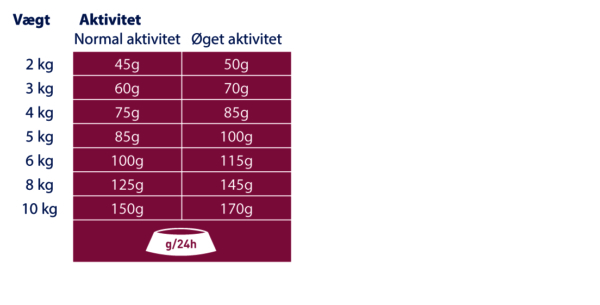 Giv foderet tør eller tilføj frisk, varmt vand (ved omkring 50-60° C) og lad det trække i et par minutter. Sørg for, at der er frisk drikkevand til rådighed på alle tidspunkter. Reducer mængden af foder, hvis du også giver din hund snacks/godbidder. I betragtning af de metaboliske forskelle mellem de enkelte hunde, kan den angivne daglige mængde reduceres med op til 15 %, hvis hunden har tendens til at være overvægtig.