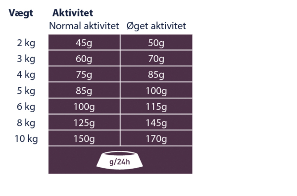 Giv foderet tør eller tilføj frisk, varmt vand (ved omkring 50-60° C) og lad det trække i et par minutter. Sørg for, at der er frisk drikkevand til rådighed på alle tidspunkter. Reducer mængden af foder, hvis du også giver din hund snacks/godbidder. I betragtning af de metaboliske forskelle mellem de enkelte hunde, kan den angivne daglige mængde reduceres med op til 15 %, hvis hunden har tendens til at være overvægtig.