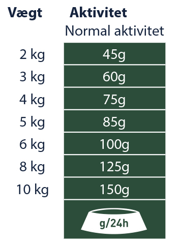 Tør eller tilsæt varmt, ferskvand (ca. 60 ° C) og lad stå i et par minutter. Opbevar frisk drikkevand til din rådighed. Hvis der tilsættes yderligere snacks eller andre supplerende produkter, skal fodermængden reduceres. På grund af individuelle forskelle i hundens metabolisme kan den givne daglige mængde reduceres med op til 15%.