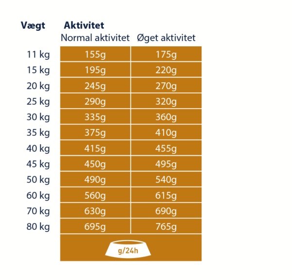 Giv foderet tør eller tilføj frisk, varmt vand (ved omkring 50-60° C) og lad det trække i et par minutter. Sørg for, at der er frisk drikkevand til rådighed på alle tidspunkter. Reducer mængden af foder, hvis du også giver din hund snacks/godbidder. I betragtning af forskellen mellem de enkelte hunde, kan den angivne daglige mængde reduceres med op til 15 %, hvis hunden har tendens til at være overvægtig.