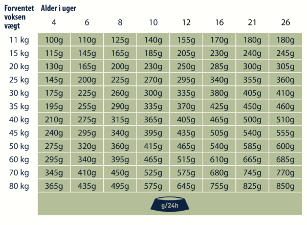 Bemærk: Mængden af foder bør øges gradvist hver 2.-3. dag, til ugentligt indtil den mængde, der anbefales for den næste aldersgruppe, er nået. Fra 27 uger overgår du langsomt til et passende juniorfoder. Vej hvalpene regelmæssigt og dokumenter deres vægtudvikling. Det kan være nødvendigt at justere mængden af foder individuelt. Fodre ikke for meget – vær opmærksom på den moderate vækst. Ved tilsætning af snacks bør fodermængden reduceres tilsvarende. Tip: Brug en del af den daglige foderration som snackserstatning. Giv foderet tør eller tilføj frisk, varmt vand (omkring 50-60° C) og lad det trække i et par minutter. Fordel den daglige foderration på flere måltider (3-4). Sørg for, at der altid er frisk drikkevand til rådighed.