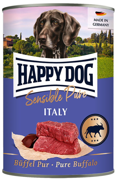 Ren nydelse af animalsk protein fra bøffel – til ægte kødelskere. Fremstillet i Tyskland af 100% kød og animalske biprodukter fra bøffel. Indeholder ingen kornprodukter og er fremstillet uden tilsat sukker. Anvendelsen af bøffel som eneste kilde til animalsk protein, gør den særlig velegnet til fodring af sensible hunde. Sensible Pure Italy kan bruges som fuldfoder eller i kombination med Happy Dog flagefoderblanding eller Happy Dog tørfoder.