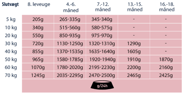 Bemærk: Mængden af foder bør justeres gradvist, indtil den anbefalede fodermængde for følgende aldersgruppe er nået. Efterhånden som slutvægten er nået, falder energibehovet, og mængden af foder skal tilpasses efter foderanbefalingerne. Vej hvalpene regelmæssigt og dokumenter deres vægtudvikling. Det kan være nødvendigt at justere mængden af foder individuelt. Fodre ikke for meget – vær opmærksom på den moderate vækst. Ved tilsætning af snacks bør fodermængden reduceres tilsvarende. Fordel den daglige foderration på flere måltider (3-4).Fodres ved stuetemperatur. Sørg for, at der altid er frisk drikkevand til rådighed.
