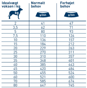 Mængden af foder skal tilpasses hundens individuelle stofskifte og skal muligvis justeres i moderate mængder. Hunden skal altid have frisk vand til rådighed.