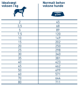 Mængden af foder skal tilpasses hundens individuelle stofskifte og skal muligvis justeres i moderate mængder. Hunden skal altid have frisk vand til rådighed.