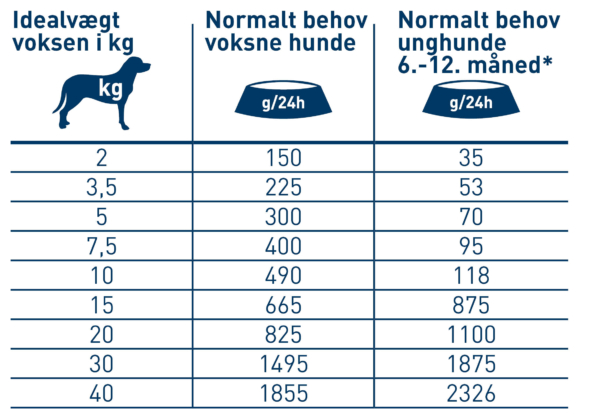 * senest mellem 12-15. levemåned skal mængden af foder langsomt reduceres til den anbefalede daglige mængde til “normale voksne hundes behov” i overensstemmelse med det faldende energibehov. Bemærk ved blandet fodring: 100 g vådfoder ≈ 40 g tørfoder