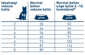* Fra den 10. levemåned kan fodermængden (efter neutralisering) langsomt reduceres til den daglige mængde, der anbefales til “det normale behov for en voksen kat” i overensstemmelse med det faldende energibehov. Ved blandet fodring bemærk: 100 g vådfoder ≈ 23 g tørfoder