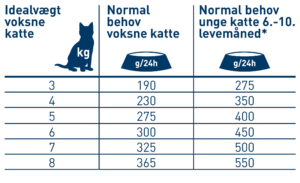 * Fra den 10. levemåned kan fodermængden (efter neutralisering) langsomt reduceres til den daglige mængde, der anbefales til “det normale behov for en voksen kat” i overensstemmelse med det faldende energibehov.