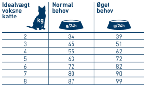 Mængden af ​​foder skal tilpasses kattens individuelle stofskifte og skal muligvis justeres i moderate mængder. Katten skal altid have frisk vand til rådighed. Ved blandet fodring bemærk: 100 g vådfoder ≈ 29 g tørfoder
