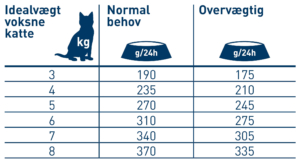Mængden af ​​foder skal tilpasses kattens individuelle stofskifte og skal muligvis justeres i moderate mængder. Katten skal altid have frisk vand til rådighed. Ved blandet fodring bemærk: 100 g vådfoder ≈ 21 g tørfoder.