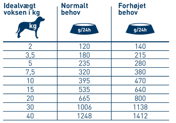 Mængden af foder skal tilpasses hundens individuelle stofskifte og skal muligvis justeres i moderate mængder. Hunden skal altid have frisk vand til rådighed.