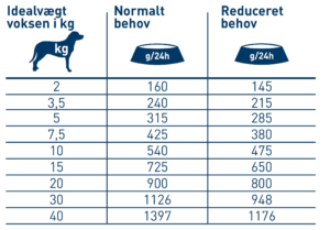 Mængden af foder skal tilpasses hundens individuelle stofskifte og skal muligvis justeres i moderate mængder. Hunden skal altid have frisk vand til rådighed. Bemærk ved blandet fodring: 100 gr vådfoder = 30 gr tørfoder